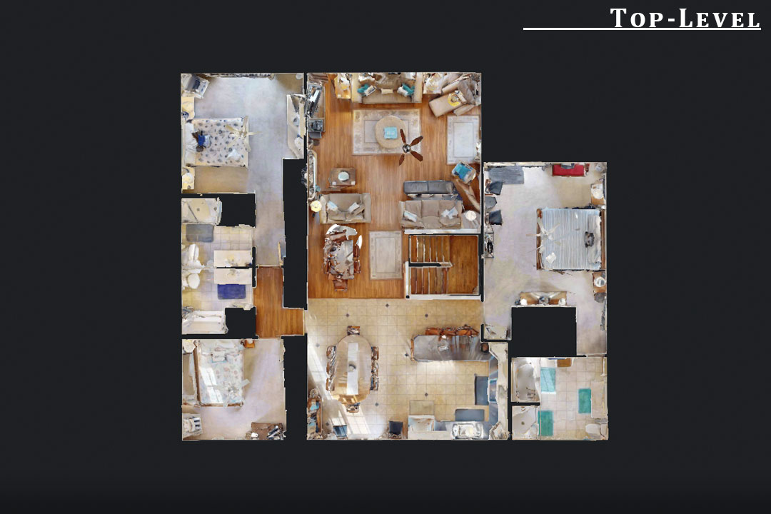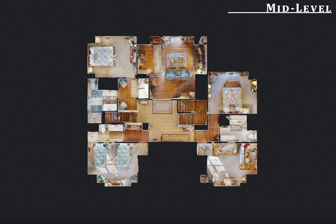 Mid-Level: Den with 35" TV, Surround Sound, Blu-Ray and DVD Player, and Deck Access; Queen Bedroom with TV, DVD Player, and Deck Access; Queen Bedroom with TV and DVD Player; Bedroom with Pyramid Bunk, Bunk Bed, TV, and DVD Player; Bedroom with 2 Twin Beds, TV, and DVD Player; Hall Full Bathroom; Hall Full Bathroom; Hall Full Bathroom; Laundry Room.