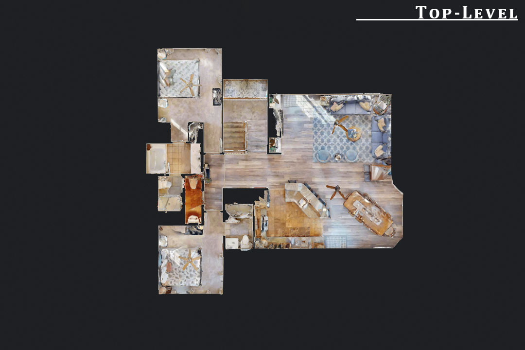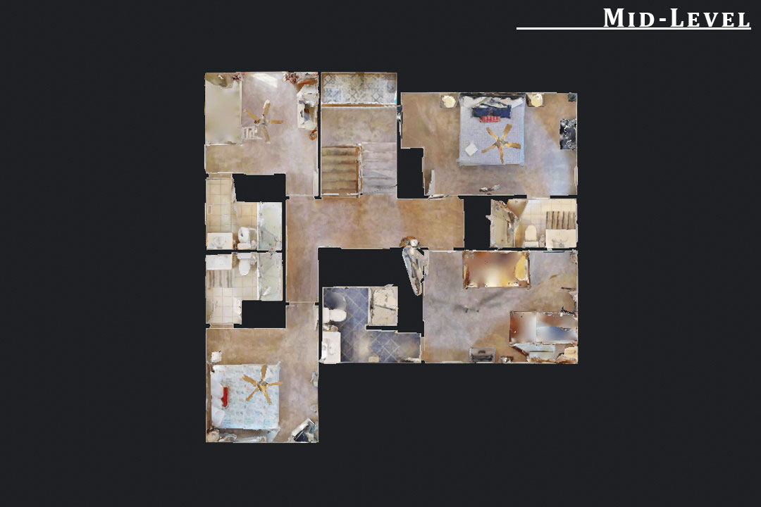 Mid-Level: King Master Bedroom with TV, Deck Access, and Attached Full Bathroom; King Master Bedroom with TV, Deck Access, and Attached Full Bathroom; Master Bedroom with 2 Bunk Beds, TV, Deck Access, and Attached Full Bathroom; Master Bedroom with Bunk Bed, TV, Deck Access, and Attached Full Bathroom.